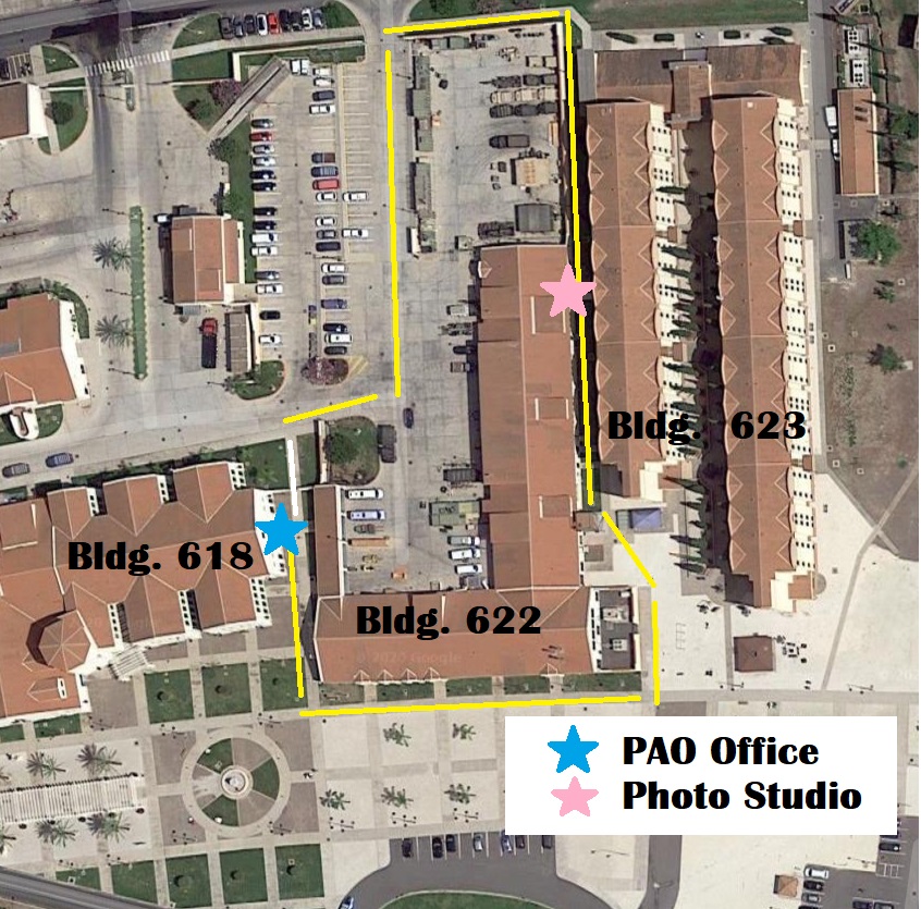The NAS Sigonella Public Affairs Office takes studio photos (command board/roster and full length photos) every Wednesday, from 9-11 a.m. at the photo studio, located on NAS 2, Bldg. 622, behind the safety office, west of the barracks (pink star on map below). No appointments needed, walk-in only.